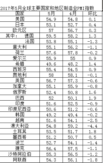 2017年5月全球主要國(guó)家和地區(qū)制造業(yè)PMI指數(shù)