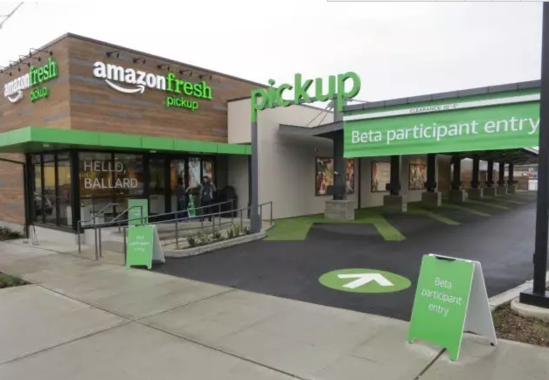在“學(xué)習(xí)傳統(tǒng)零售”這方面,亞馬遜在今年3月份內(nèi)測(cè)了自己的“生鮮提貨點(diǎn)(Amazon Fresh Pickup)”,整體邏輯類似于傳統(tǒng)店的“開車自提”。